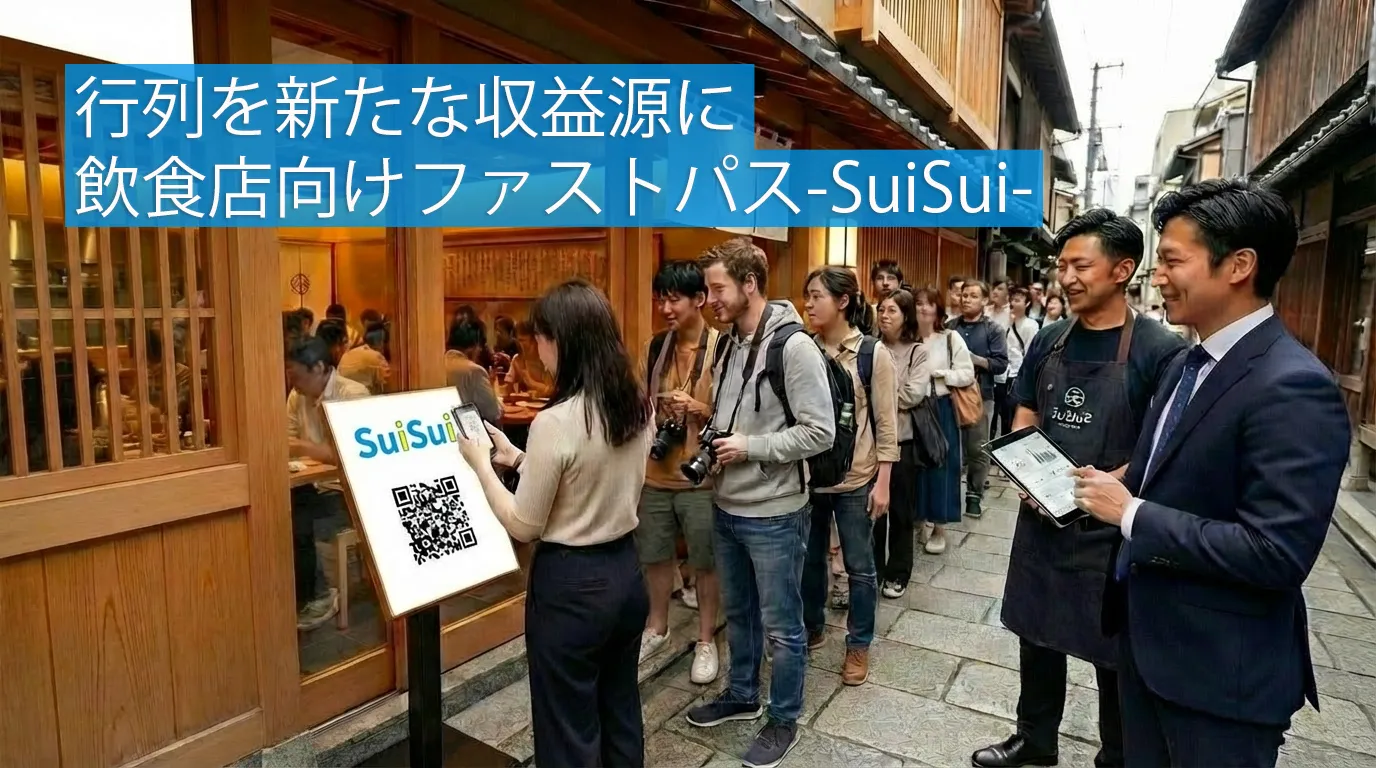 「SuiSui(スイスイ)」は、飲食店の行列をスキップできる「優先入店サービス」です。テーマパークのファストパスのように、お客様はスマートフォンから少額の利用料を支払うことで、長い列に並ぶことなくスムーズに入店が可能になります。店舗様は導入費用や月額料金を一切かけずに、このシステムを利用でき、さらに手数料収益を得ることができます。